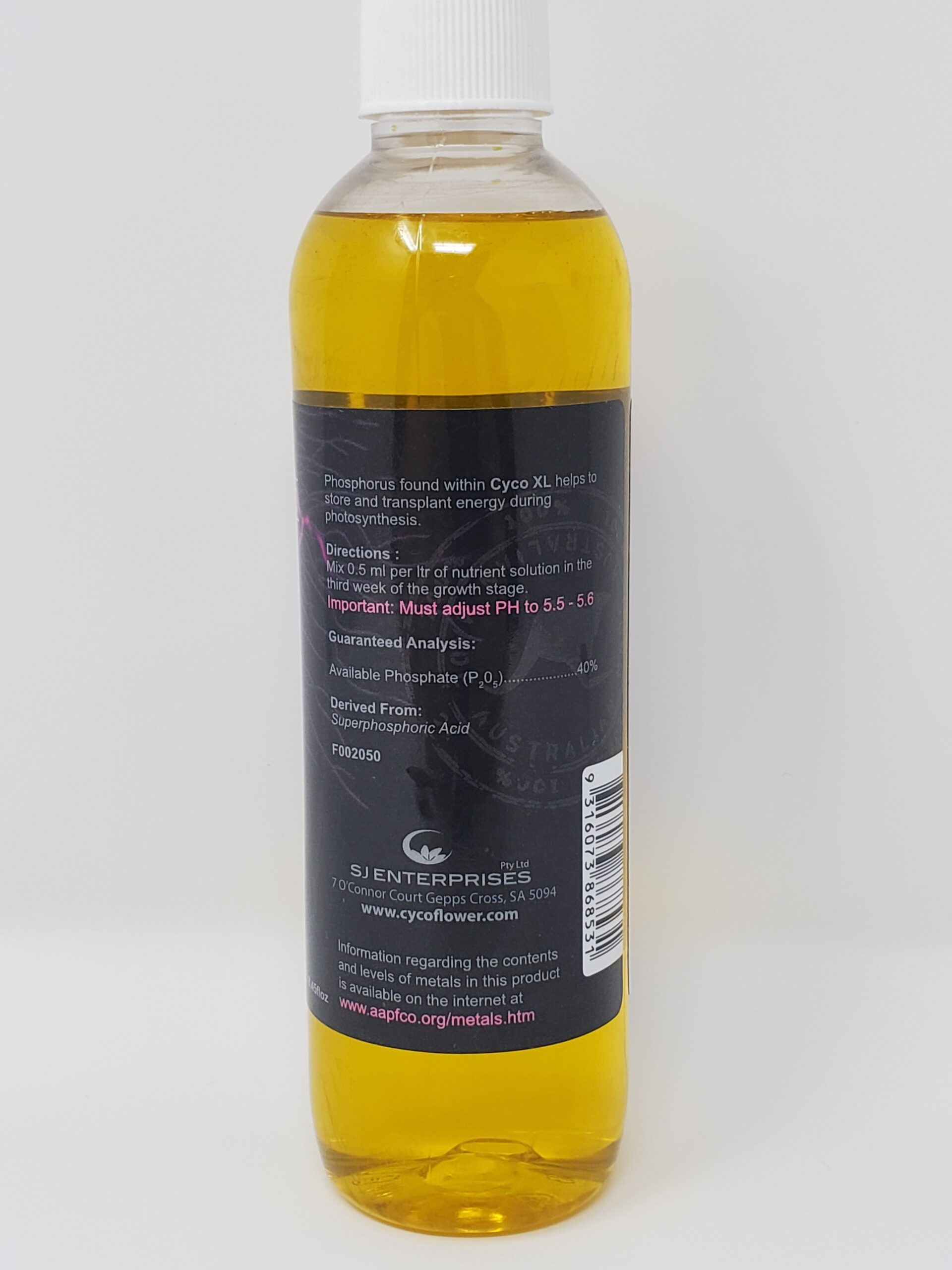 Cyco Platinum Series Grow XL is the premier product of the Cyco Platinum Series line of plant nutrients. Used only for one week in the vegetative stage of growth, Cyco Grow XL greatly encourages new root, stem, and leaf formation. Cyco Grow XL consists of super phosphoric acid which is produced from dissolving pharmaceutical grade phosphates in sulfuric acid. The resultant product is an ultra-purified and extremely available form of phosphate. When fed to a plant, the latent acid cleans the surface of the roots simultaneously infusing the surface with a large shot of phosphorus resulting in explosive root, foliage, and stem formation. Cyco Grow XL also through its application encourages the uptake of iron, nitrogen, and potassium to support the short, intense burst of growth as a resultant of Cyco Grow XL application.