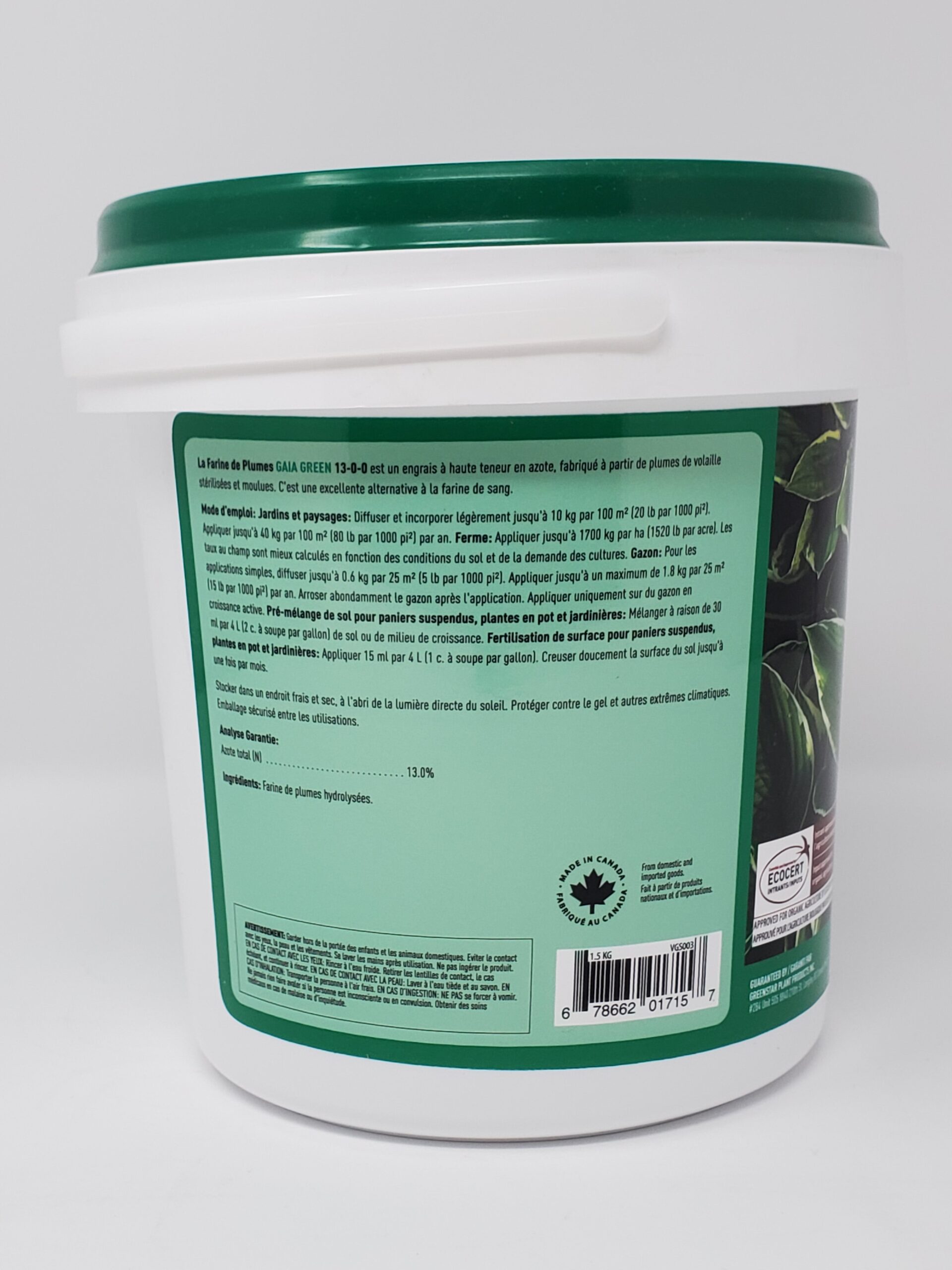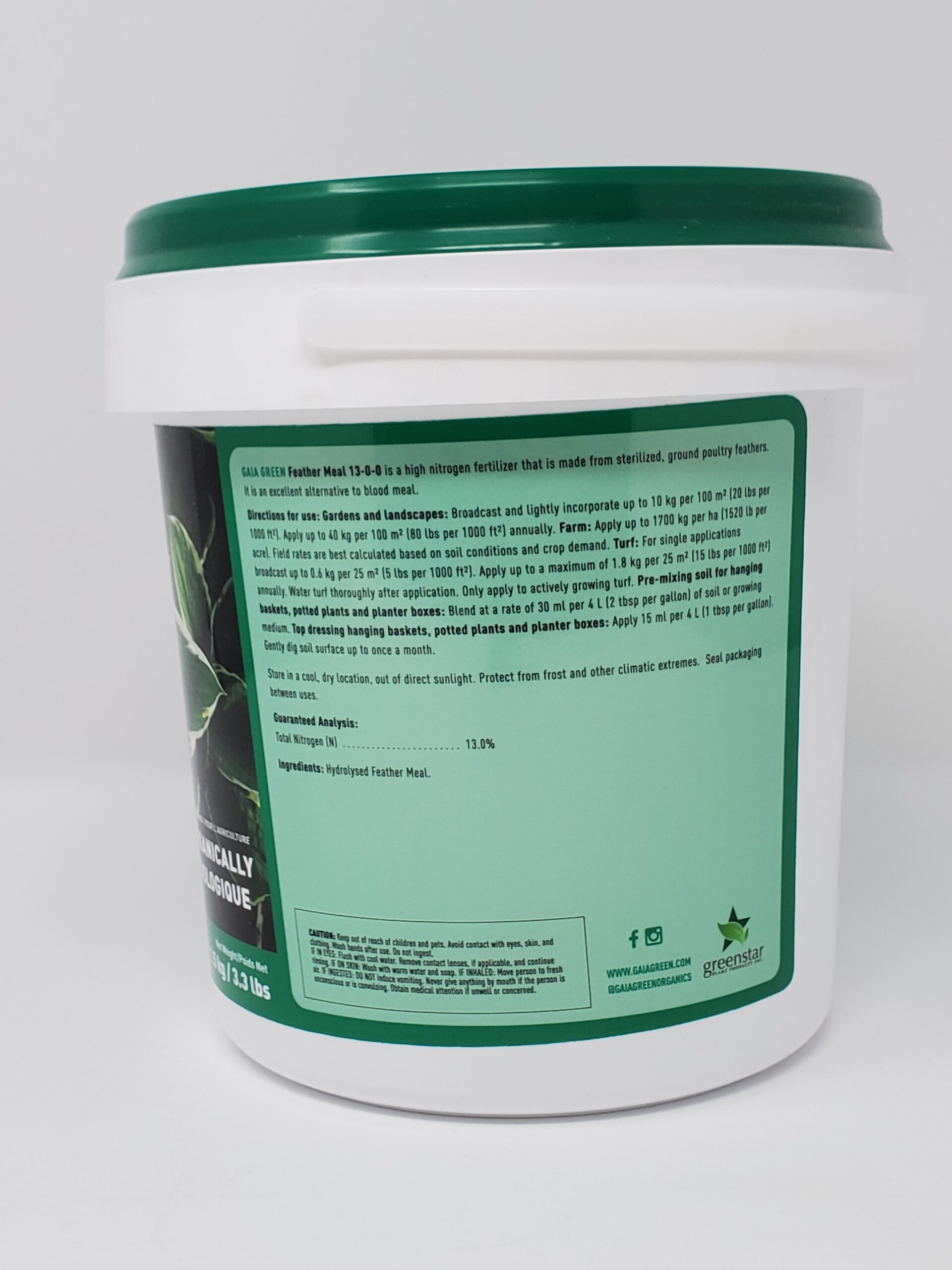 Gaia Green Organics Feather Meal 13-0-0 is a premium, high-nitrogen organic fertilizer made from hydrolyzed poultry feathers. Designed to release nitrogen slowly, it provides a long-lasting nutrient source that promotes lush, vigorous leafy growth and overall plant health. This makes it an excellent choice for vegetables, lawns, landscapes, and container gardens.