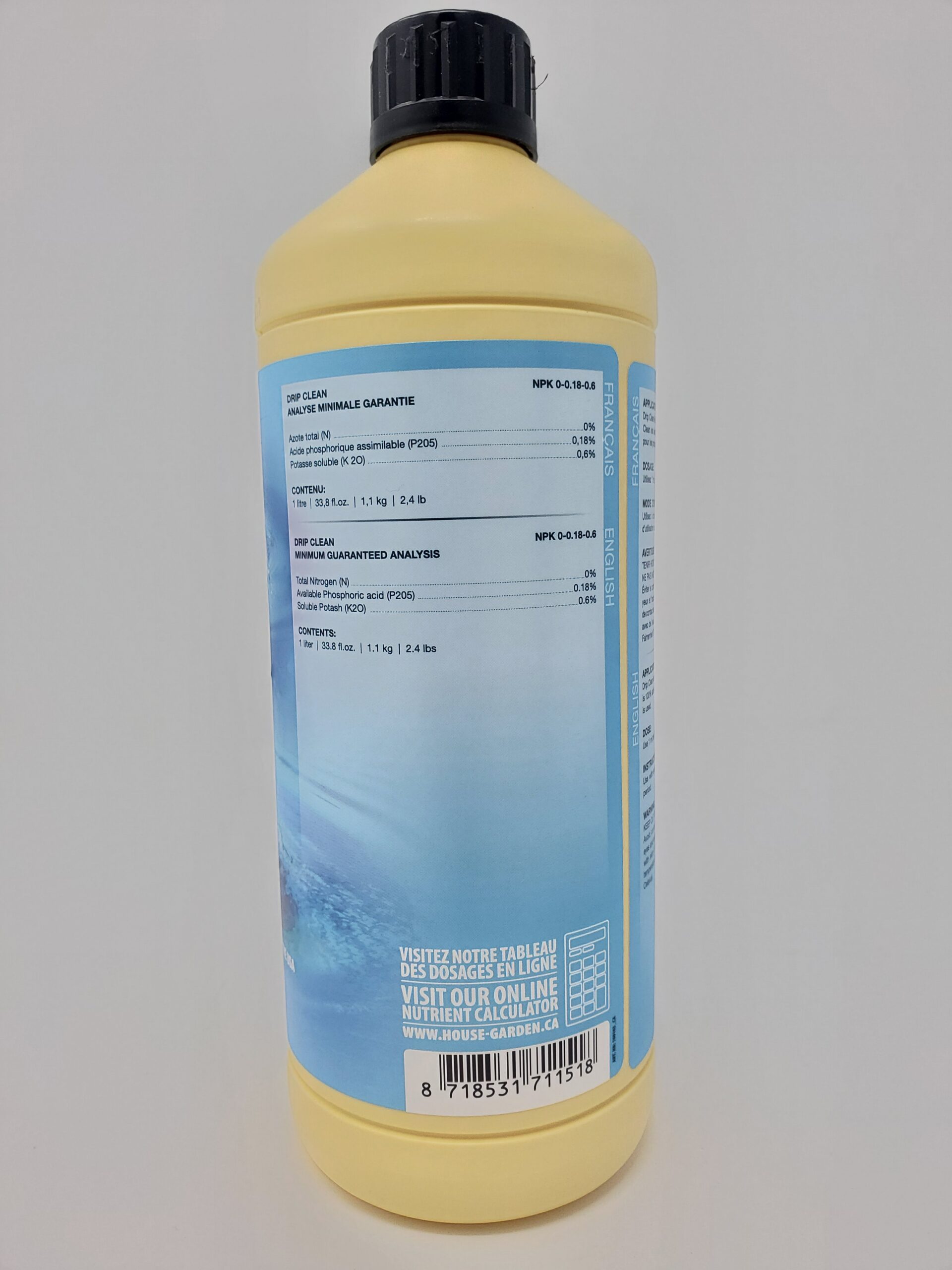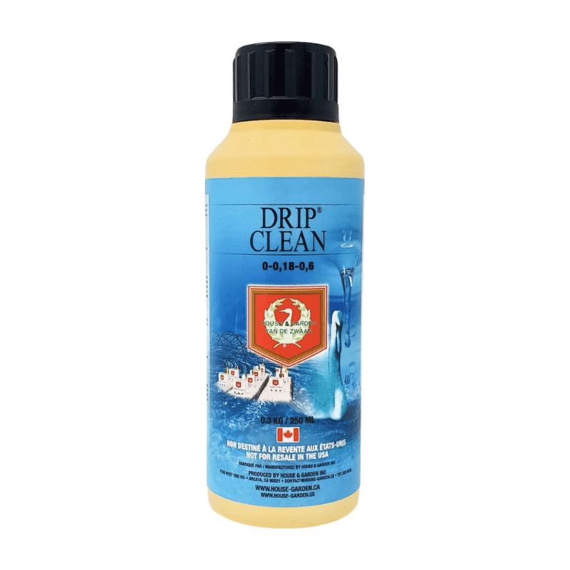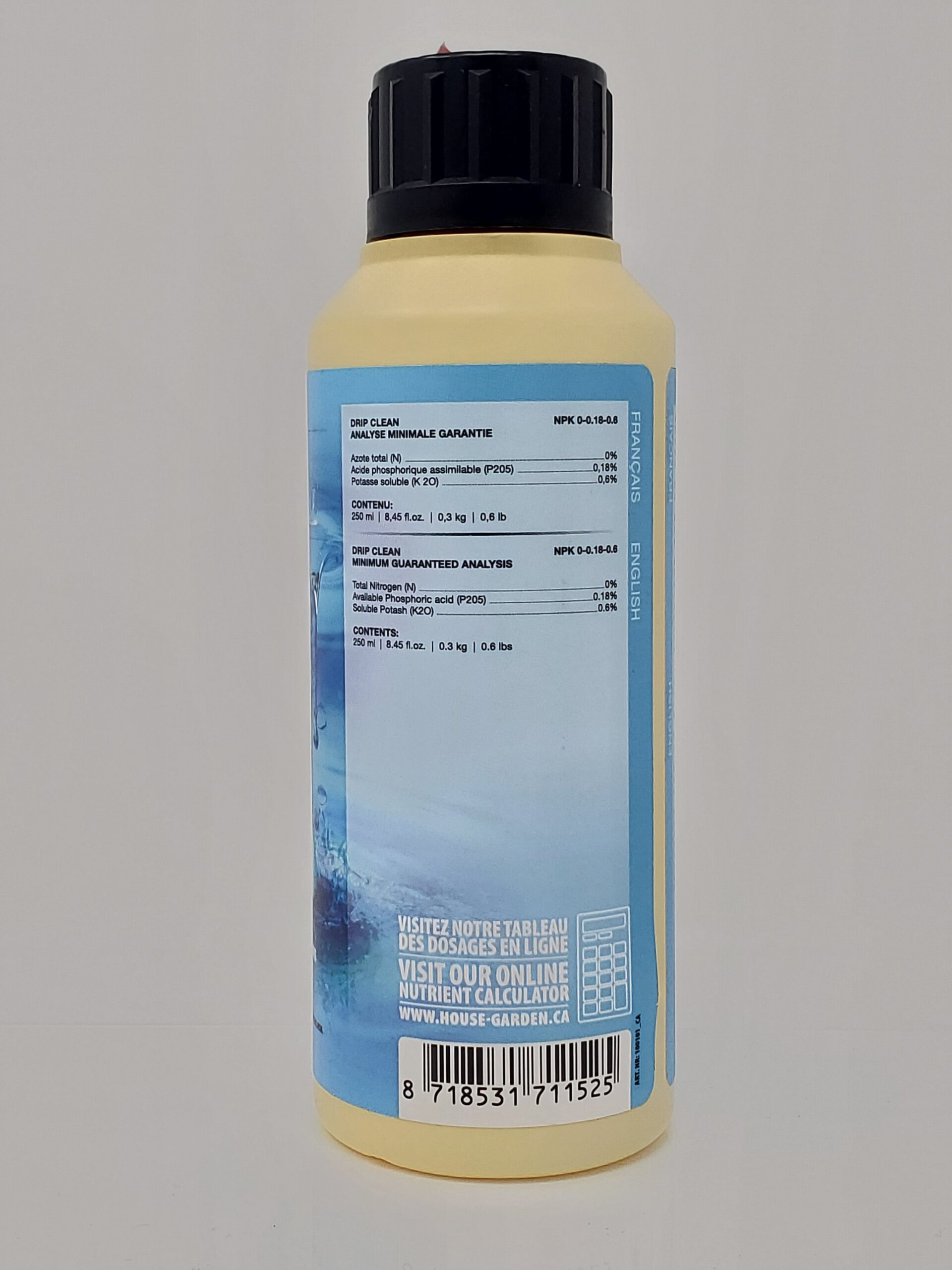 House & Garden Drip Clean is a unique additive designed to keep your growing system free from salt deposits and nutrient build-up. By preventing clogging in drip lines, hoses, and substrates, Drip Clean ensures your plants receive a consistent flow of water and nutrients for maximum health and performance.
